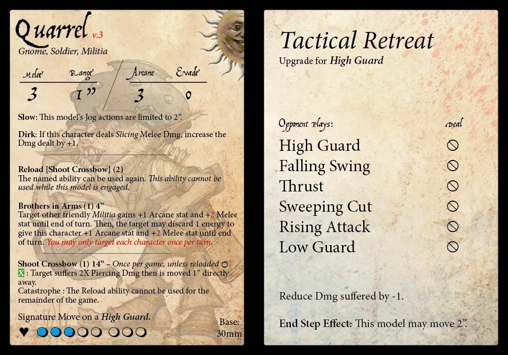 Brothers in Arms on Quarrel’s original card, gave +1 Arcane and +2 Melee to a friendly Militia and could be used as many times as energy allowed. A dominant tactic emerged to pump Young Jack up to incredibly high Melee Stat (so high that every card in the deck but one was in the Jack player’s hand and he could guarantee a kill). Quarrel got a v2, which dropped the +2 Melee Stat down to +1, fixing the Jack problem. But then shrewd players began stacking the the +1 Arcane on the Gnomish Airship. In a Mama’s Wrath turn, it was possible to achieve two back-to-back shots at Arcane 8, X+2 Dmg and a 14” threat range. There aren’t many models in the game that can survive that! Basically the v2 fix to Quarrel - we came to realise - wasn’t the right fix. It’s the stacking of Stat buffs onto one model that was the issue. He’s back to +2 Melee/+1 Arcane, but can now only target each friendly model once per turn. Hopefully third time’s a charm for this deceptively powerful model!