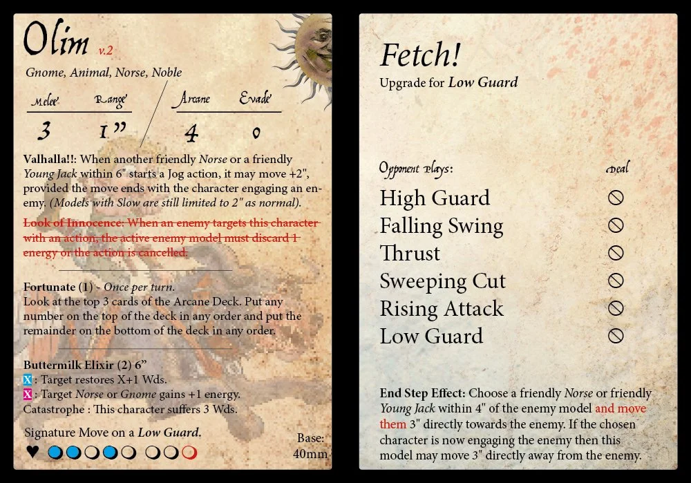 An issue has been reported by a handful of players with Olim as a moonstone carrier benefitting from Look of Innocence and Bodyguard (usually from Brunhilde in Norse lists), meaning he is too difficult to harm enough to knock stones loose. With new support options for Gnomes and Animals incoming, we felt this largely under-the-radar NPE was likely to become more widespread and again, it was better to get ahead of it. Clearly our boy has grown up a little since his initial introduction (I’m not crying, you’re crying) and he has lost his Look of Innocence, but gained +1 health box as compensation.