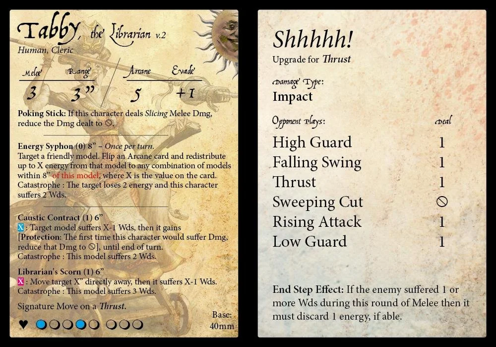 Tabby, the Librarian gains a couple of words to clarify that the recipient of energy from Energy Syphon must be within 8” of her, not the donor of the energy. This is always how it was meant to be played but the additional words avoid any potential for confusion.