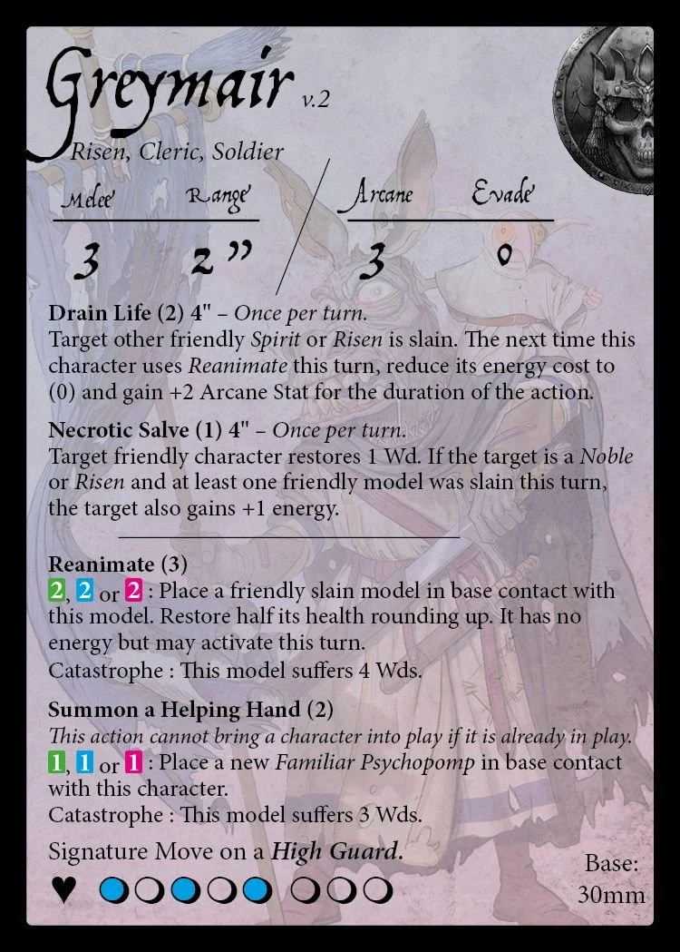 Since the Shades have been out for a while and Reanimators are now a much more common sight on the table, players have certainly wised up to how to play against them. Namely: avoid killing characters and leave them at 1 wound remaining so they don't generate much energy and hence can't do much. With the Shades’ lack of healing, if done right, it can be devastating, as in most cases, you'd prefer your models dead rather than stuck on 1 wound. This is where Greymair comes in, who now punishes your opponent for doing this.